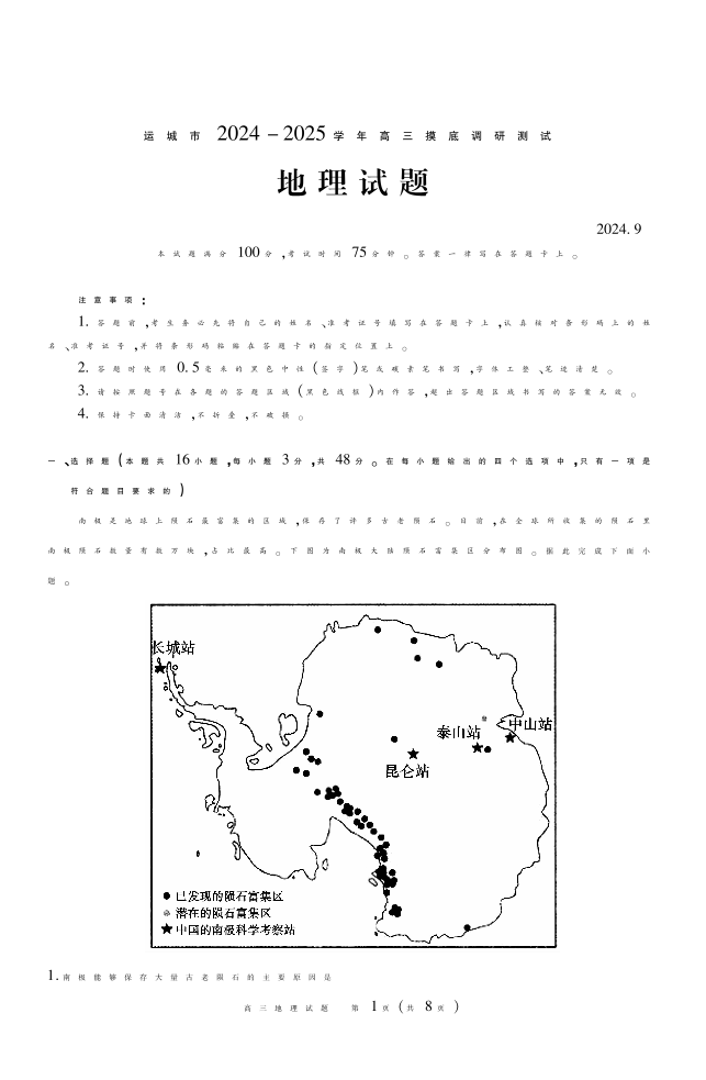 山西省运城市2024-2025学年高三摸底调研测试地理