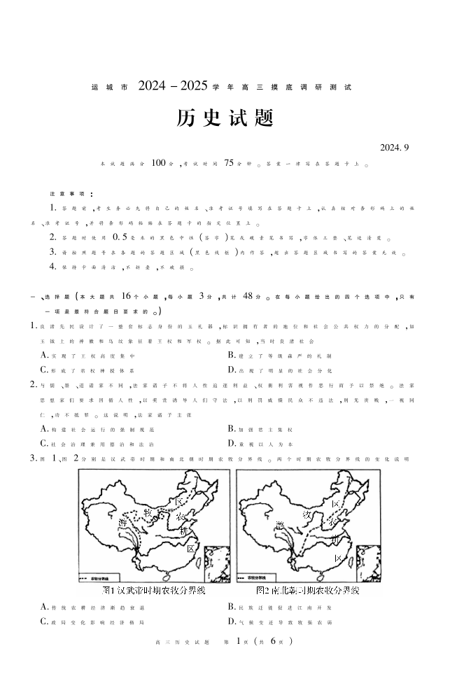 山西省运城市2024-2025学年高三摸底调研测试历史
