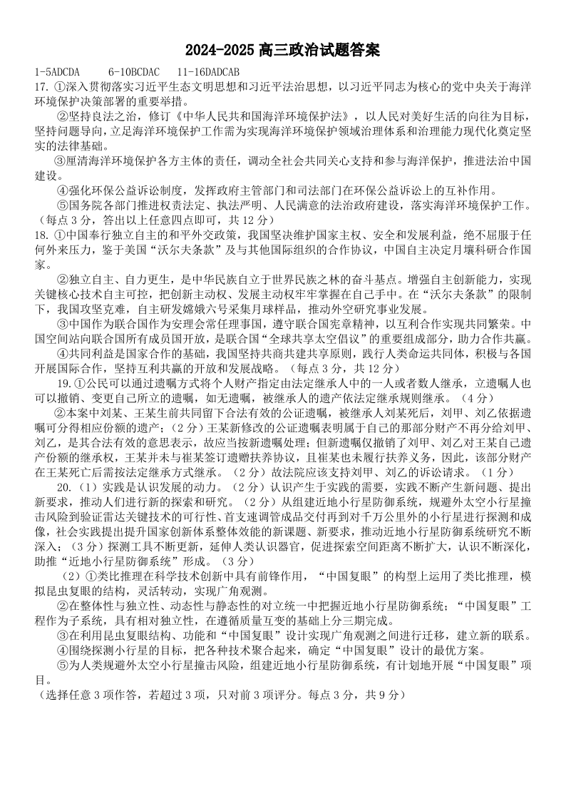山西省运城市2024-2025学年高三摸底调研测试政治答案