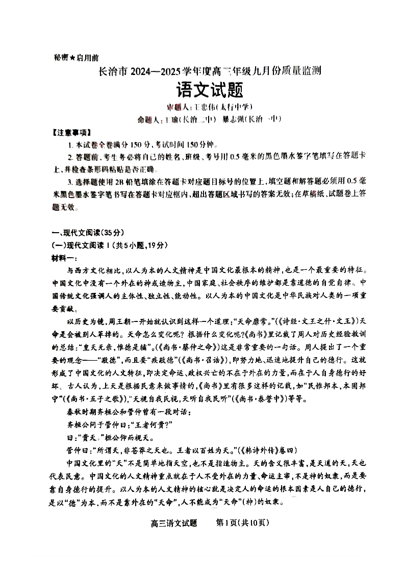 山西长治市2024-2025学年度高三年级九月份质量检测试题语文