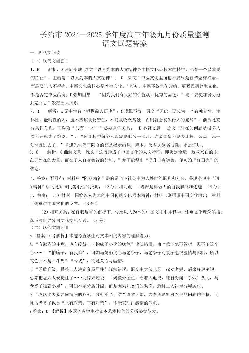 山西长治市2024-2025学年度高三年级九月份质量检测试题语文答案