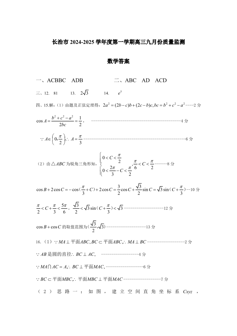 山西长治市2024-2025学年度高三年级九月份质量检测试题数学答案