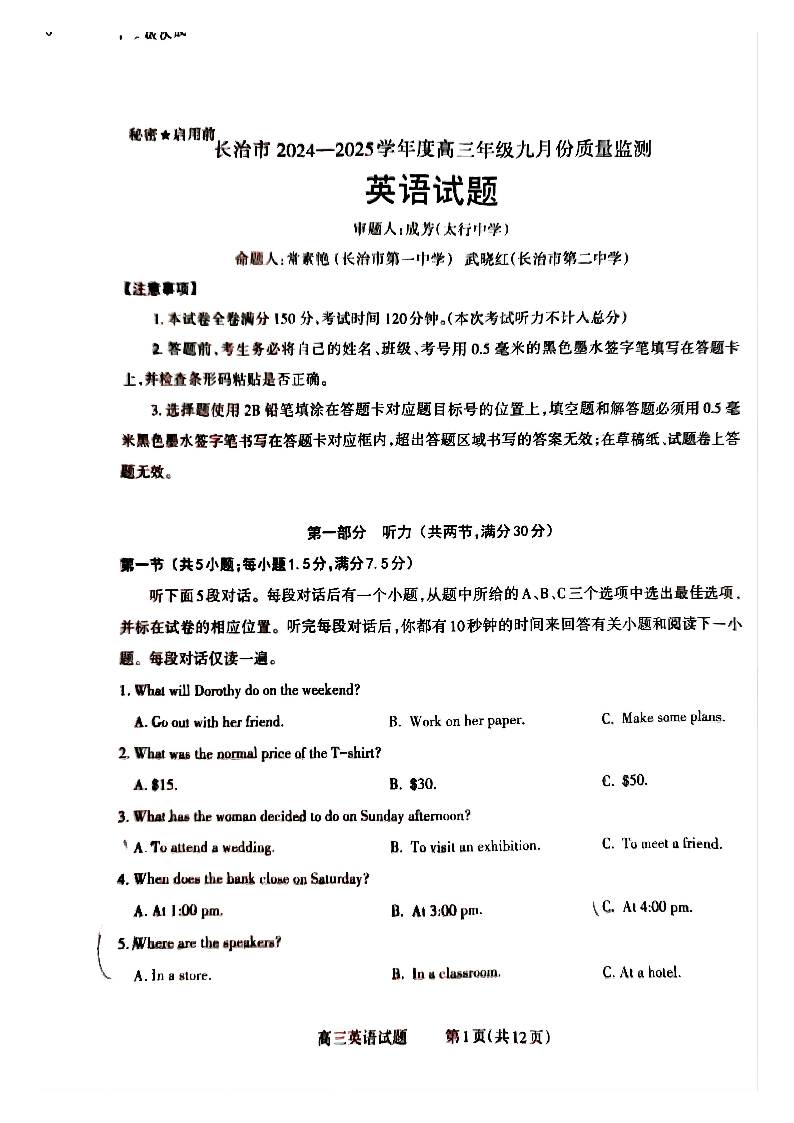 山西长治市2024-2025学年度高三年级九月份质量检测试题英语