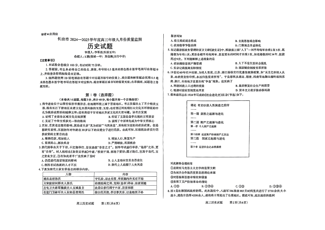 山西长治市2024-2025学年度高三年级九月份质量检测试题历史