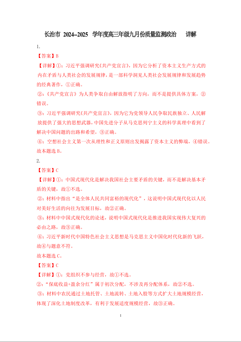 山西长治市2024-2025学年度高三年级九月份质量检测试题政治答案