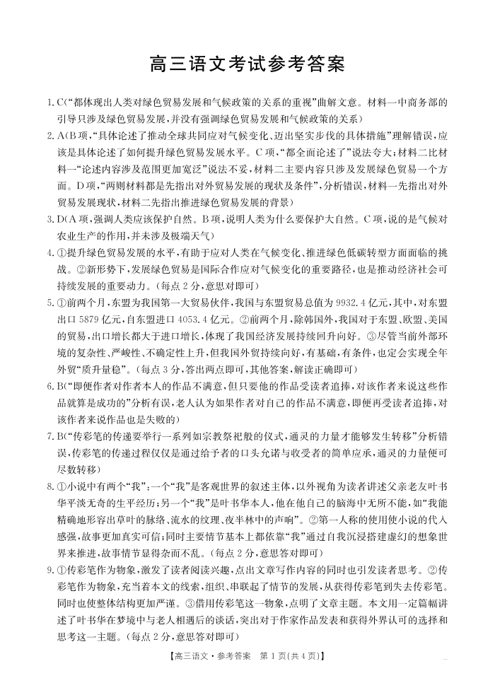 陕西省部分学校高三年级2025届9月联考语文答案