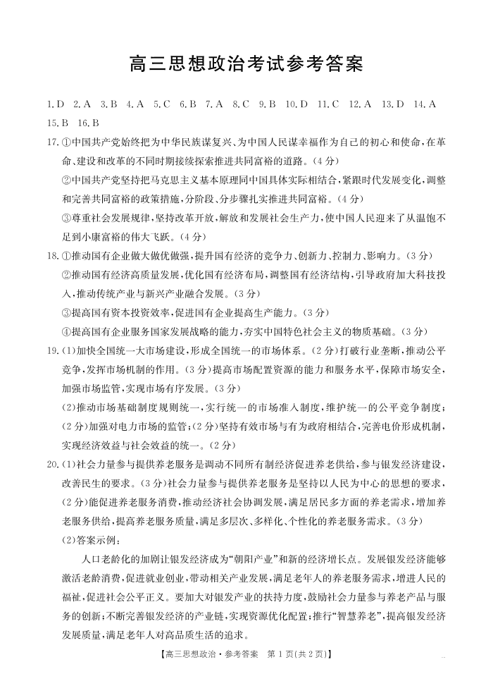 陕西省部分学校高三年级2025届9月联考政治答案
