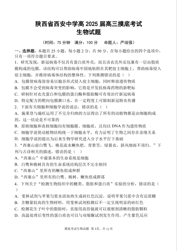 陕西省西安中学高2025届高三摸底考试生物