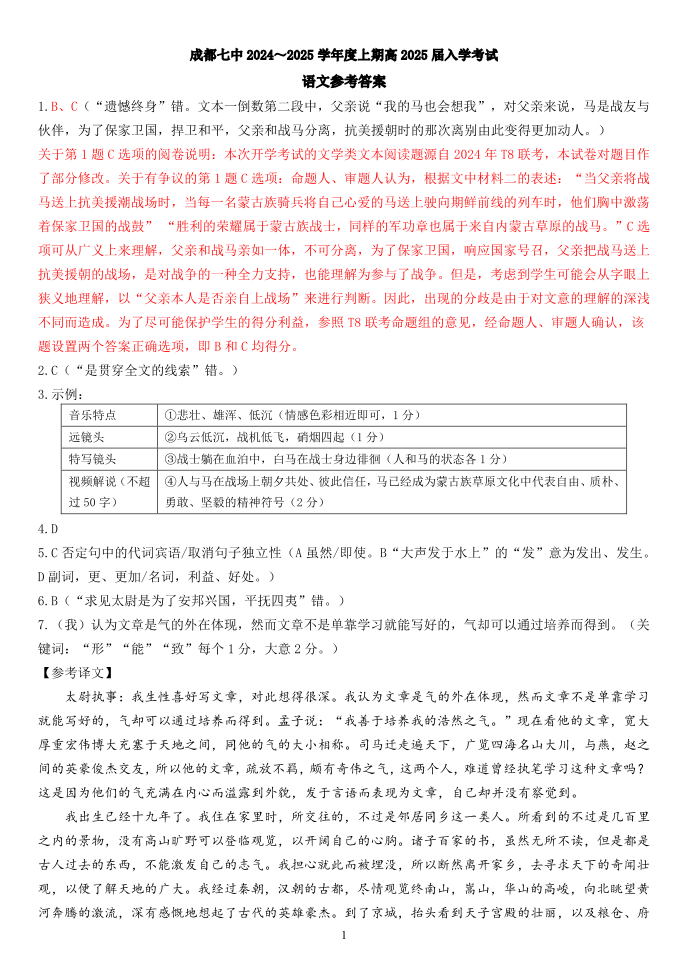 四川省成都市第七中学2024-2025学年度上期高2025届入学考试语文答案
