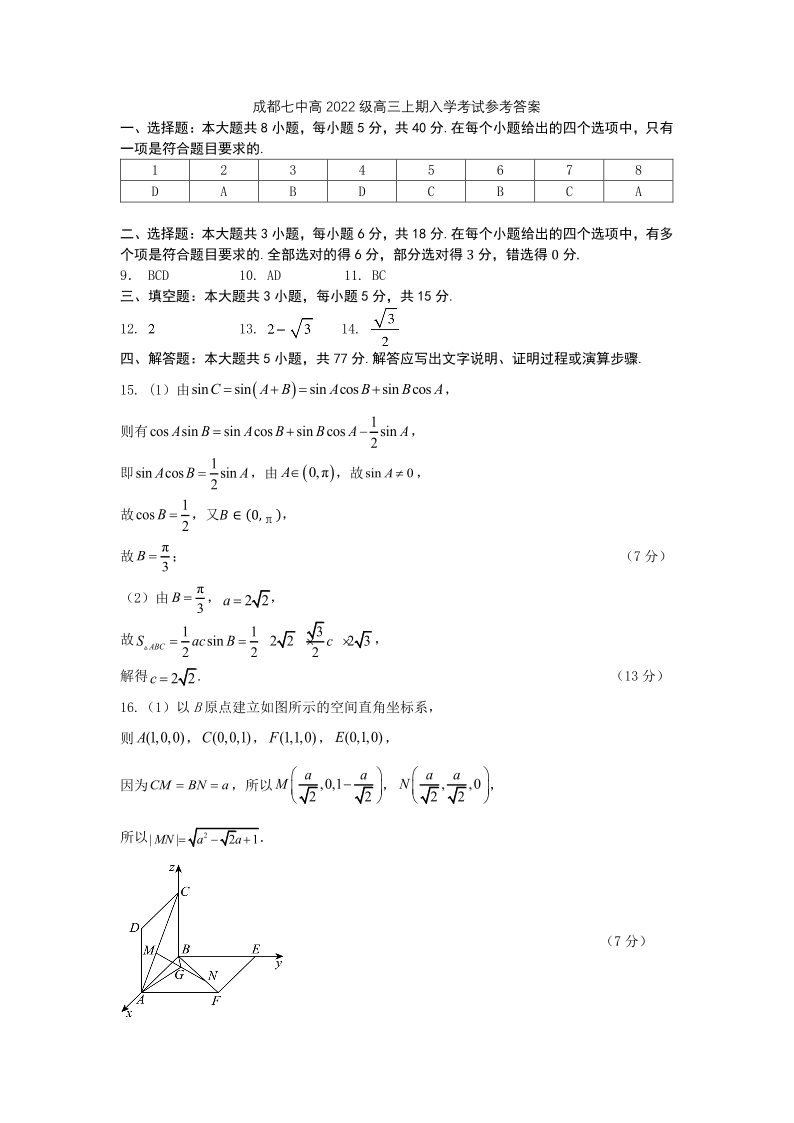 四川省成都市第七中学2024-2025学年度上期高2025届入学考试数学答案