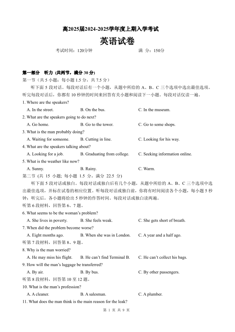 四川省成都市第七中学2024-2025学年度上期高2025届入学考试英语