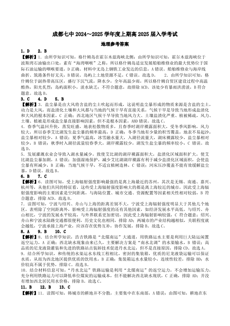 四川省成都市第七中学2024-2025学年度上期高2025届入学考试地理答案
