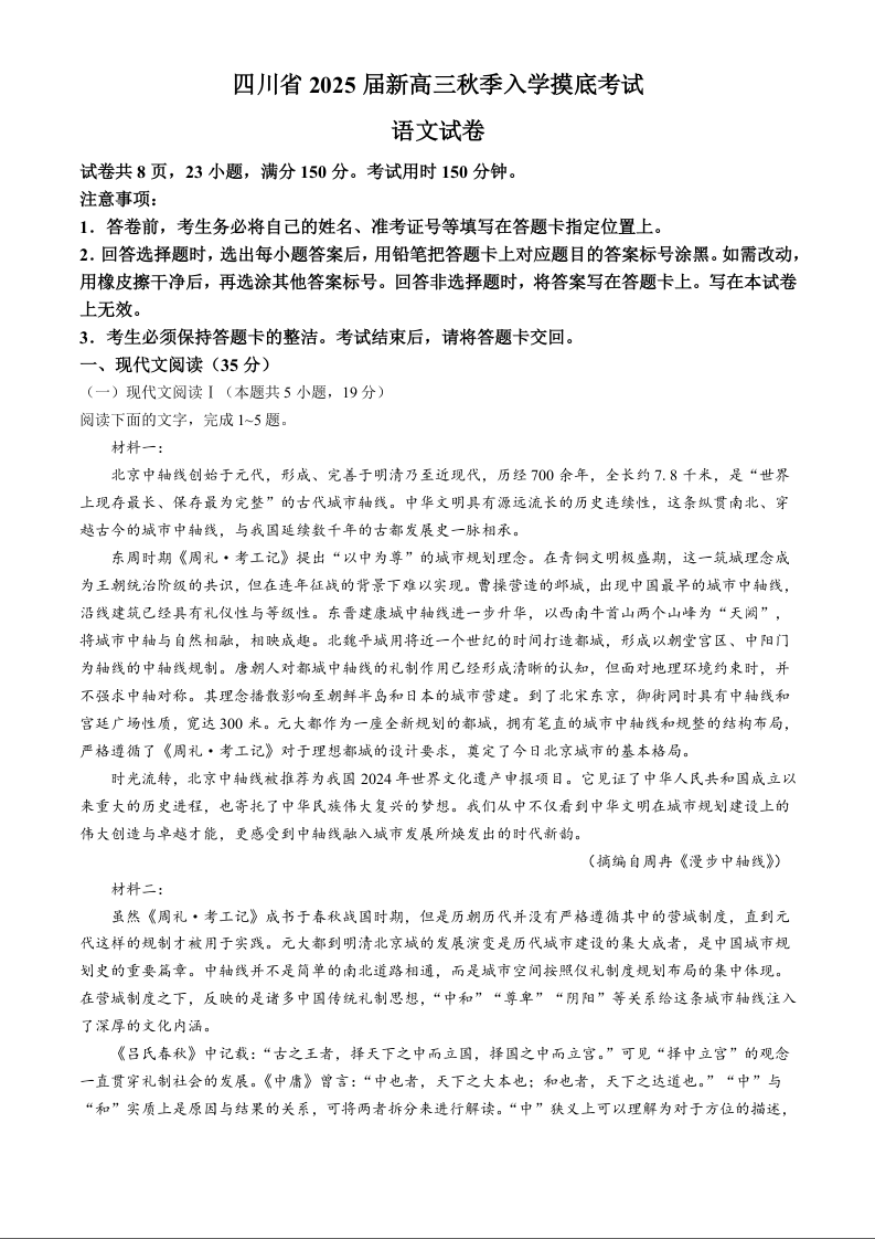 四川省2025届新高三秋季入学摸底考试语文+答案