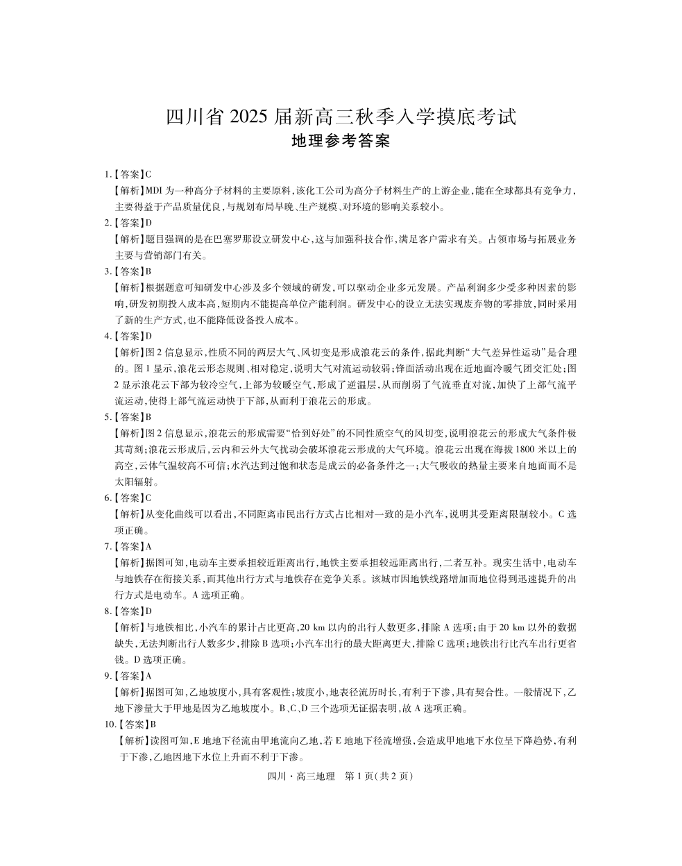 四川省2025届新高三秋季入学摸底考试地理答案