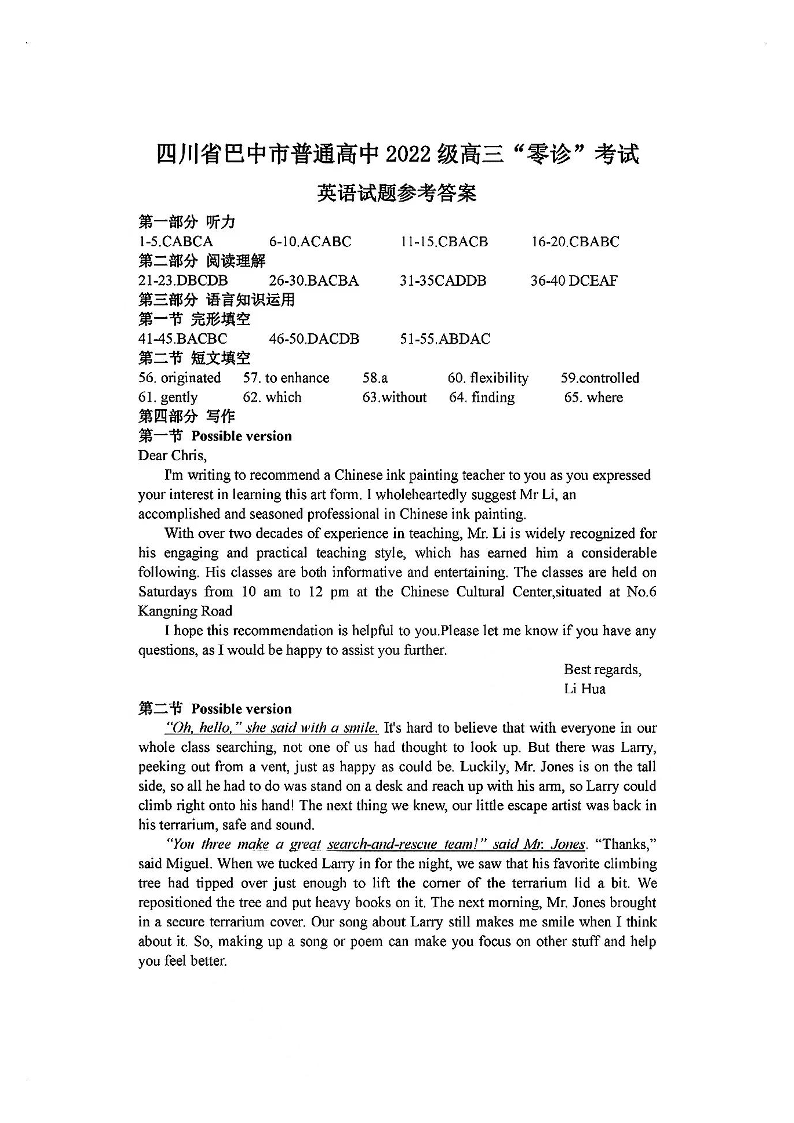 四川省巴中市普通高中2022级”零诊“考试英语答案