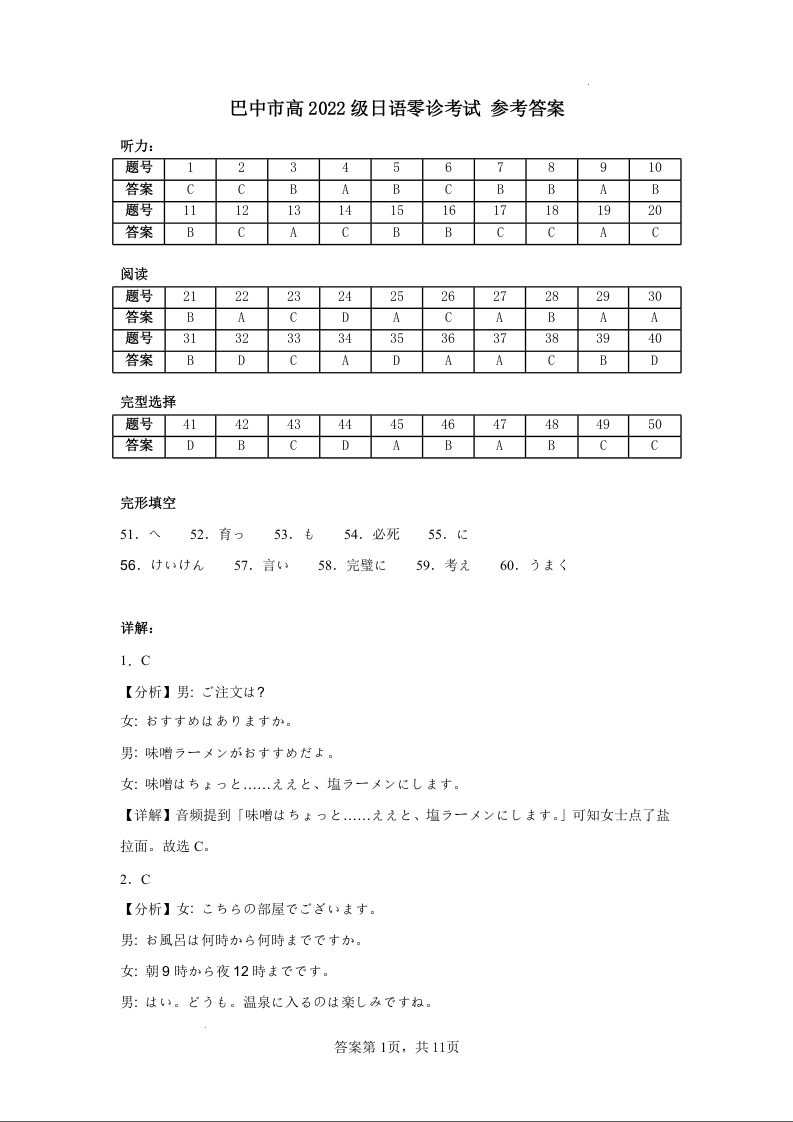 四川省巴中市普通高中2022级”零诊“考试日语答案