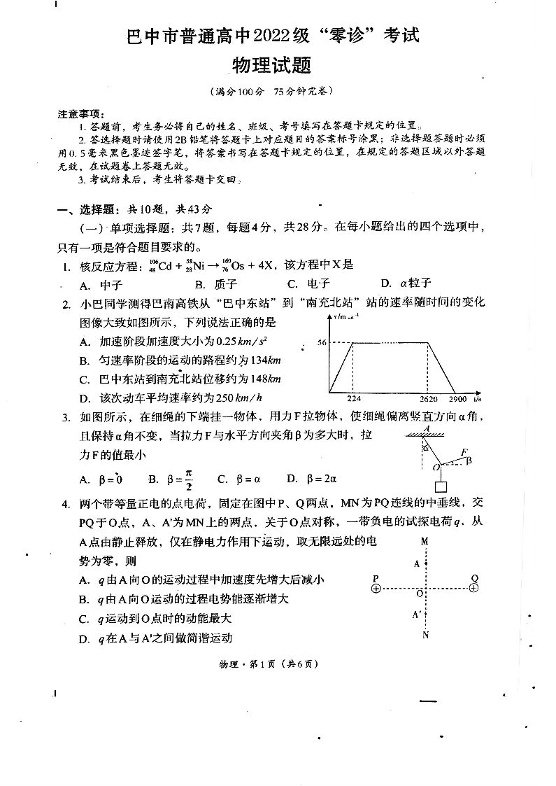 四川省巴中市普通高中2022级”零诊“考试物理