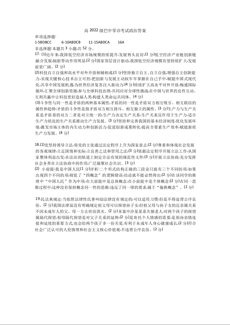 四川省巴中市普通高中2022级”零诊“考试政治答案