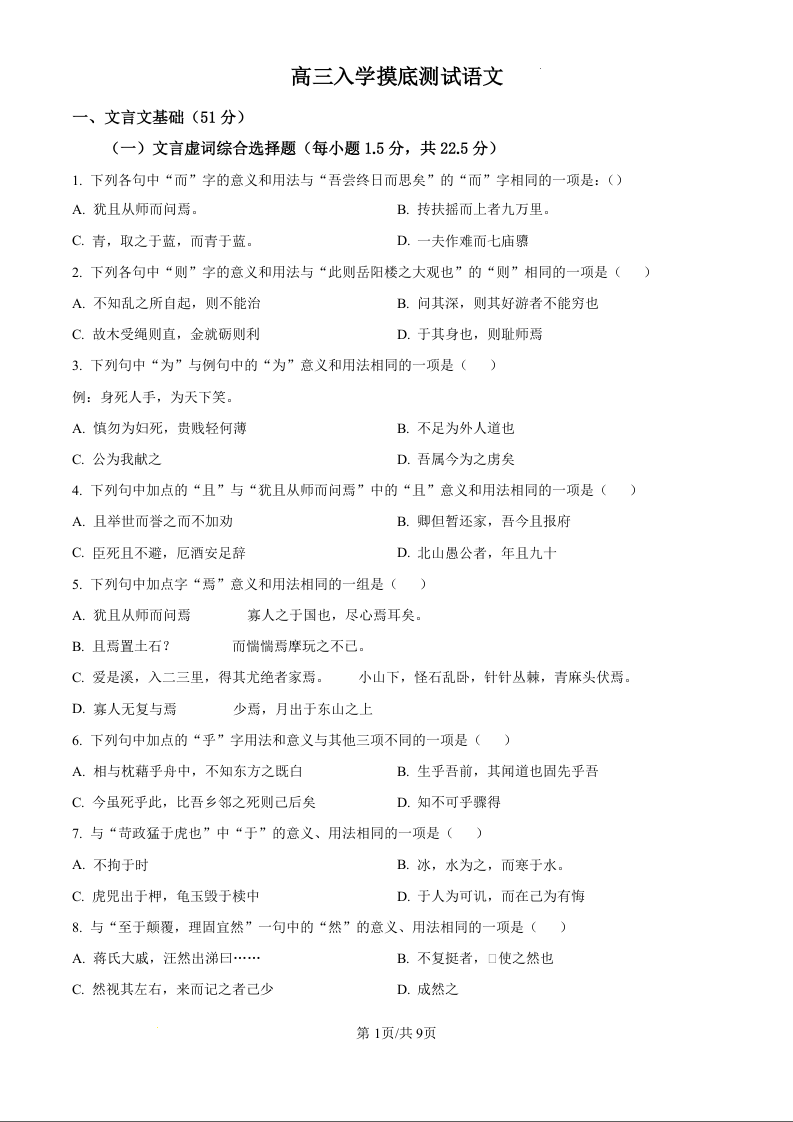 四川省成都列五中学2025届高三入学摸底测试语文试题(原卷版)