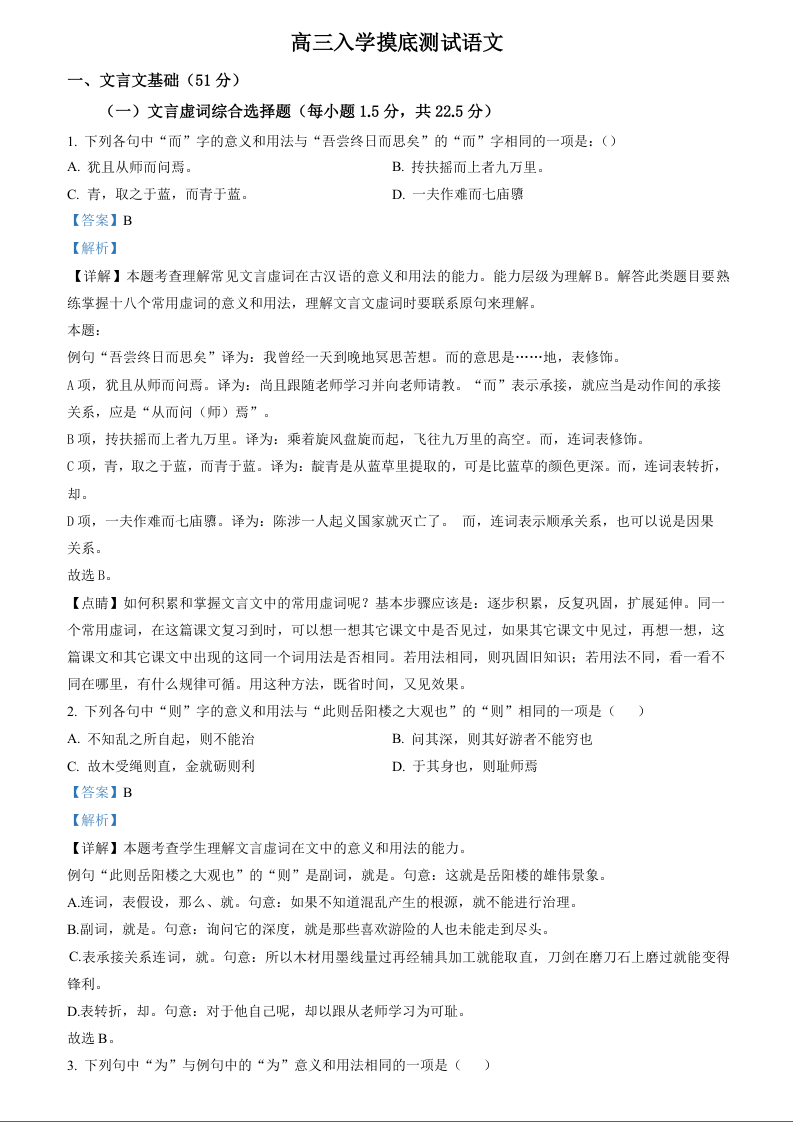 四川省成都列五中学2025届高三入学摸底测试语文试题(解析版)