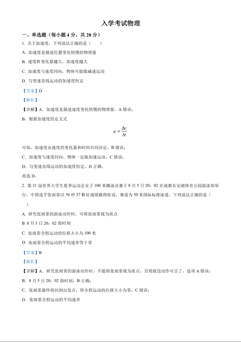 四川省成都列五中学2025届高三入学摸底测试物理试题(解析版)