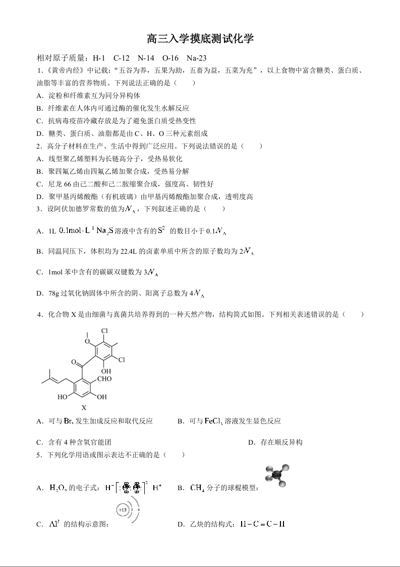 四川省成都列五中学2025届高三入学摸底测试化学+答案