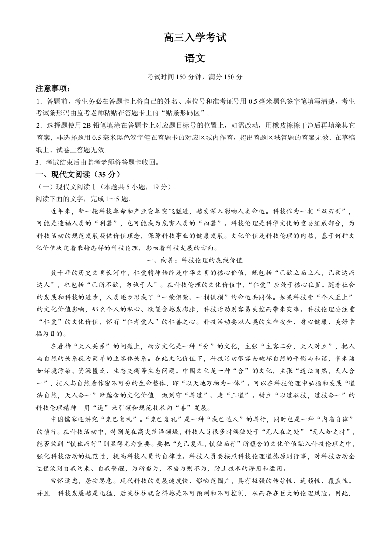 四川省成都市部分高中2025届高三上学期入学考试语文+答案