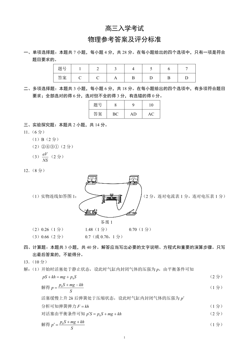 四川省成都市部分高中2025届高三上学期入学考试物理答案及评分标准