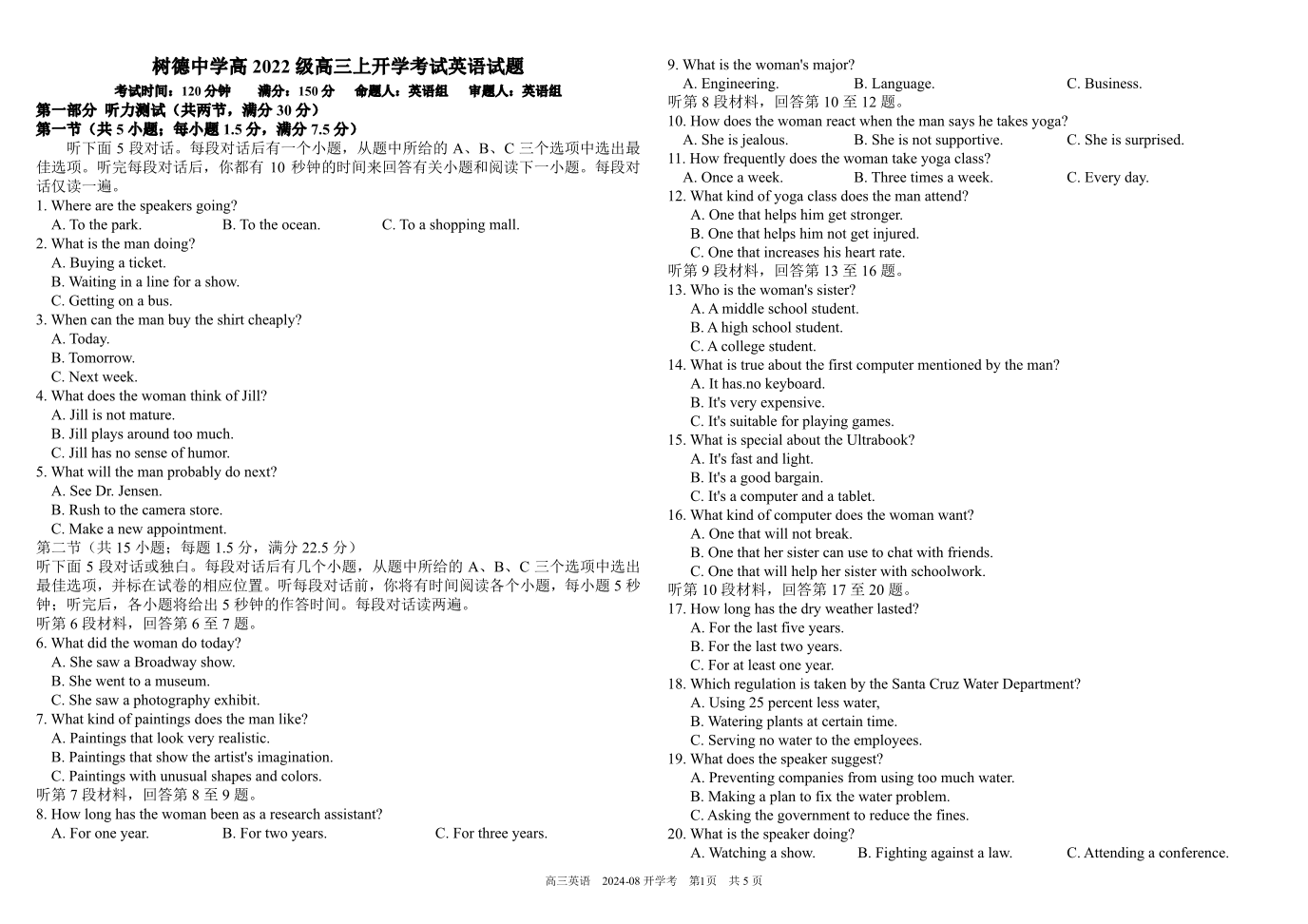 四川省成都市树德中学高2022级高三开学考试英语+答案