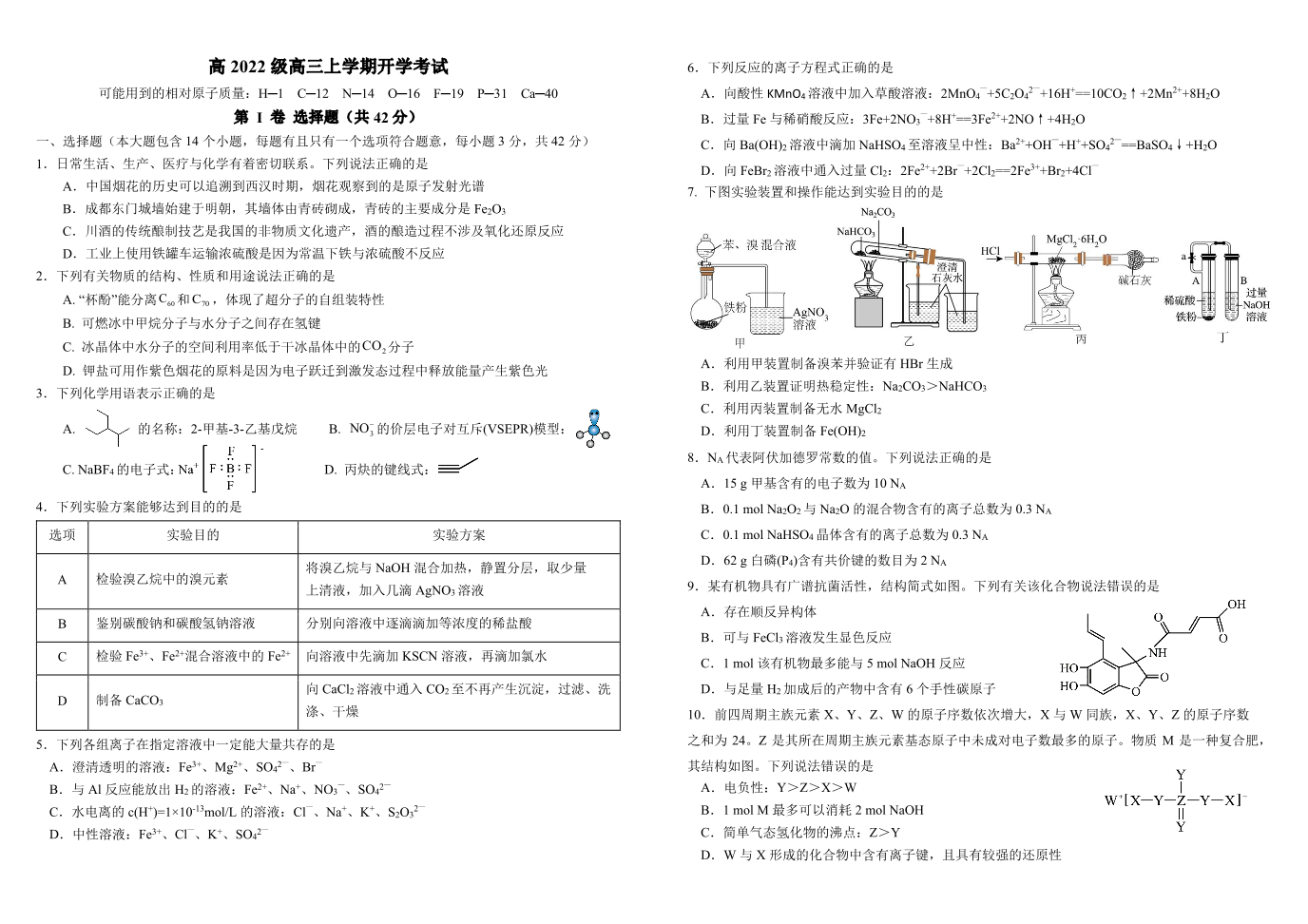 四川省成都市树德中学高2022级高三开学考试化学+答案