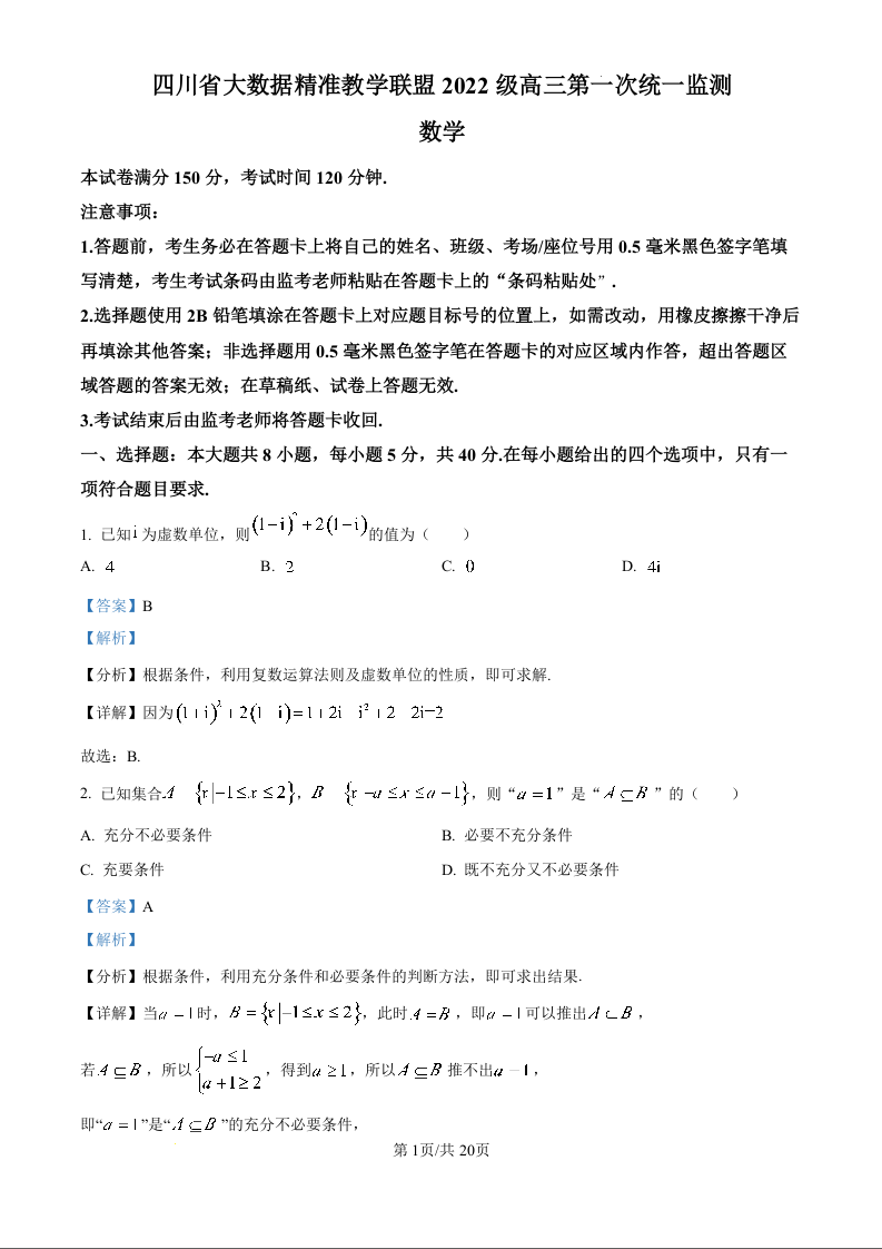四川省大数据精准教学联盟2022级高三第一次统一检测数学答案