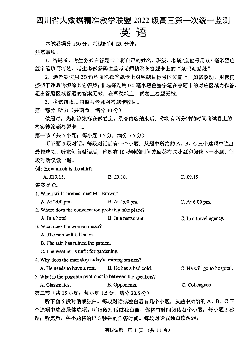 四川省大数据精准教学联盟2022级高三第一次统一检测英语