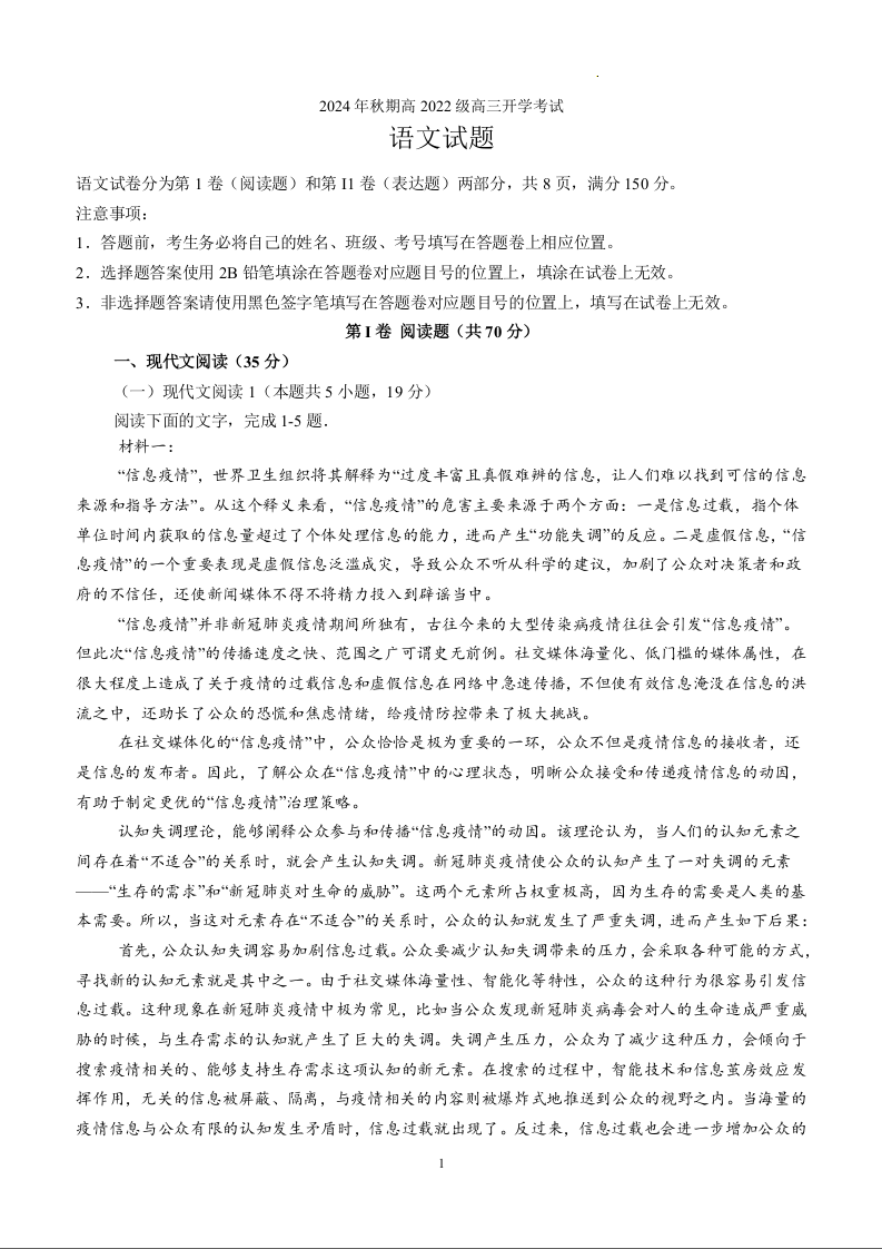 四川省泸州市叙永第一中学校高2022级高三上学期开学考试语文