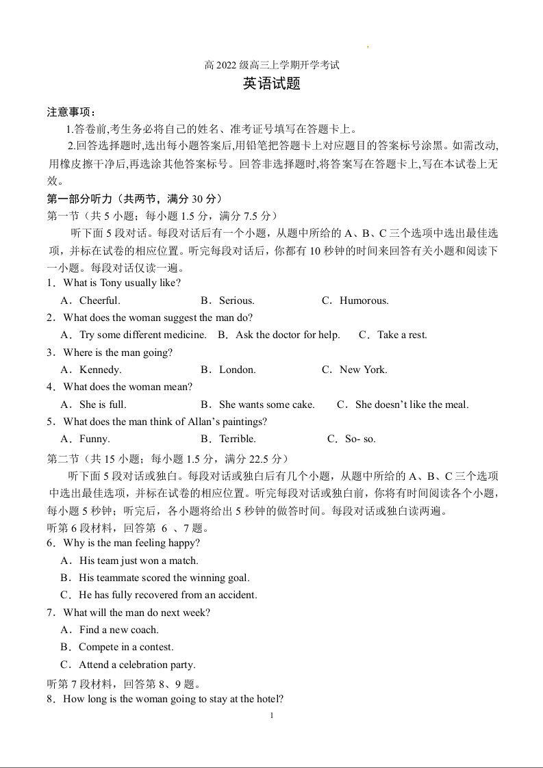 四川省泸州市叙永第一中学校高2022级高三上学期开学考试英语