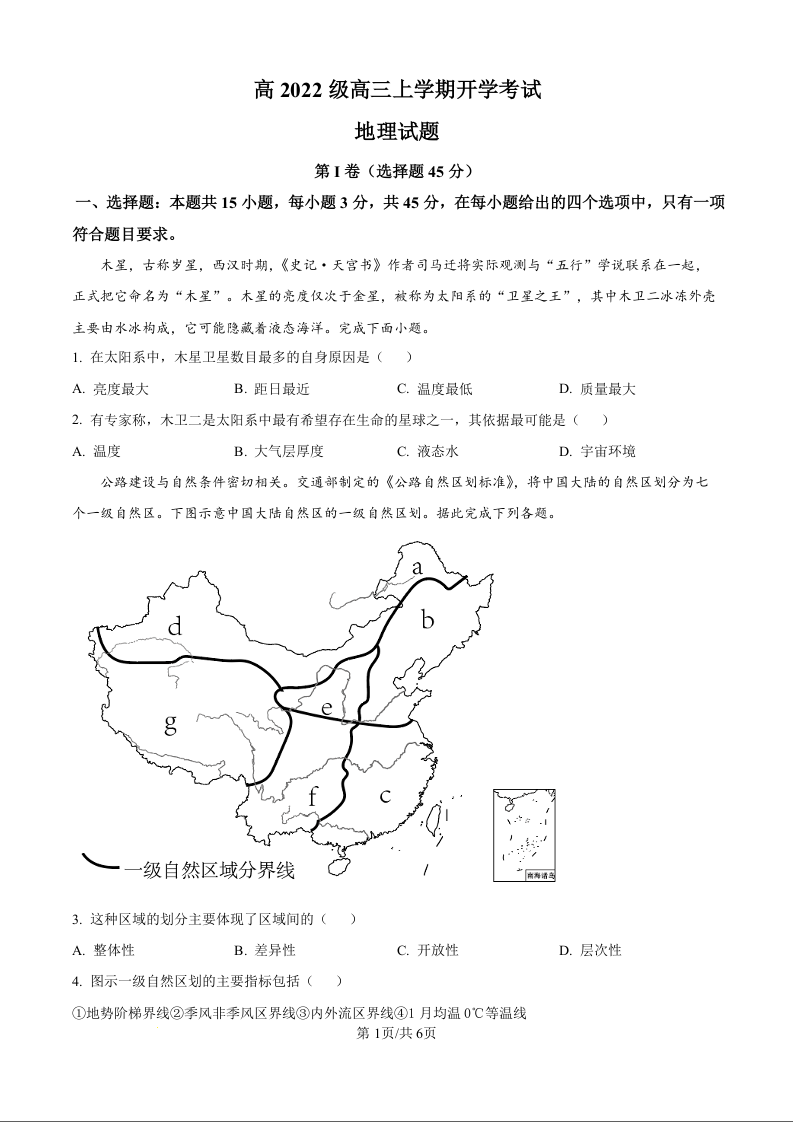 四川省泸州市叙永第一中学校高2022级高三上学期开学考试地理试题(原卷版)