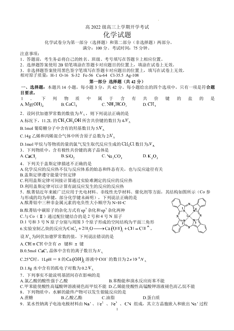 四川省泸州市叙永第一中学校高2022级高三上学期开学考试化学