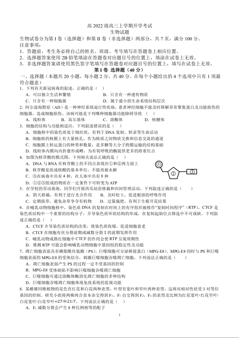 四川省泸州市叙永第一中学校高2022级高三上学期开学考试生物