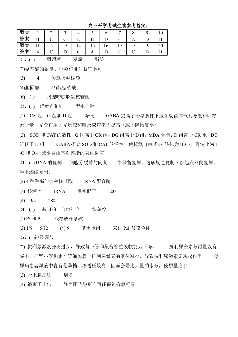 四川省泸州市叙永第一中学校高2022级高三上学期开学考试生物答案