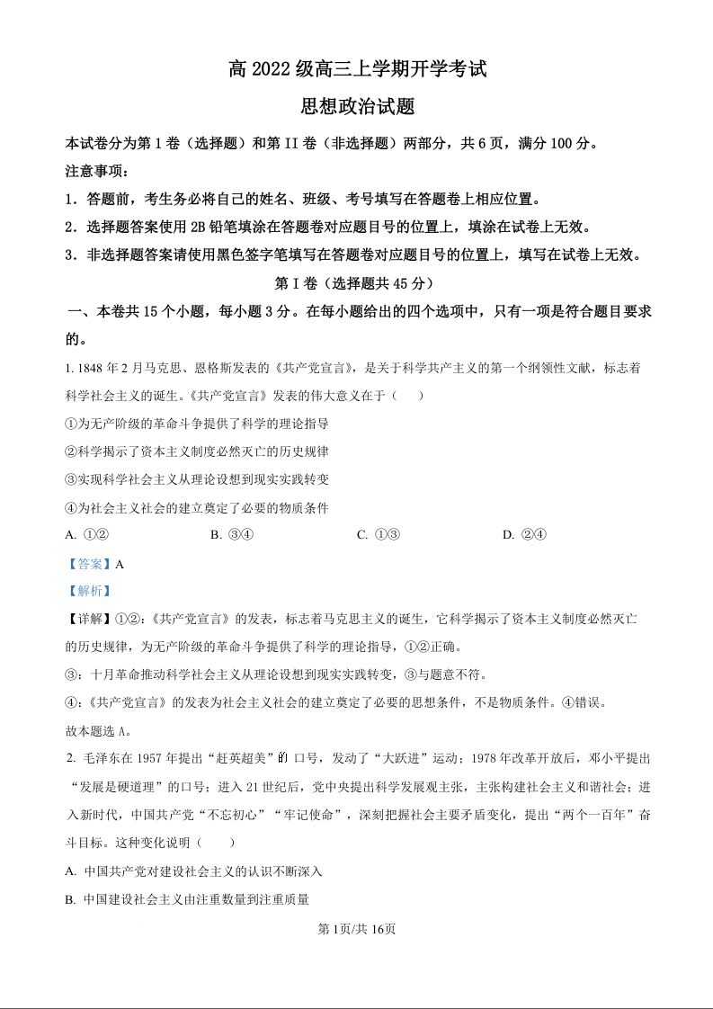 四川省泸州市叙永第一中学校高2022级高三上学期开学考试政治试题(解析版)