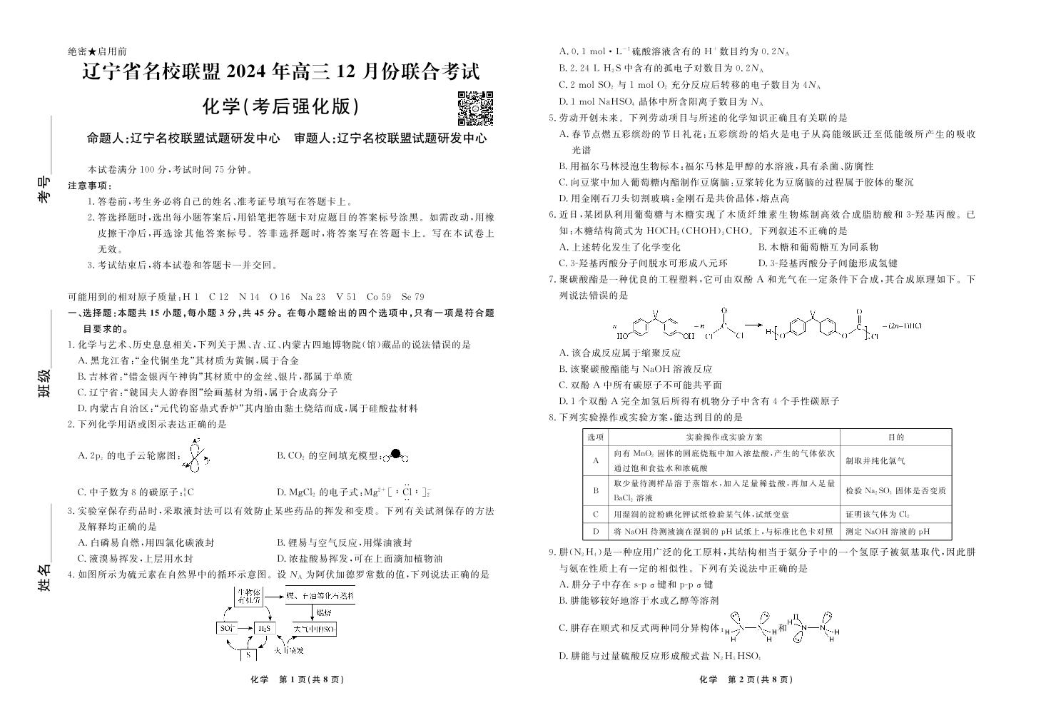 辽宁名校联盟2024年高三12月联考(考后强化版)化学