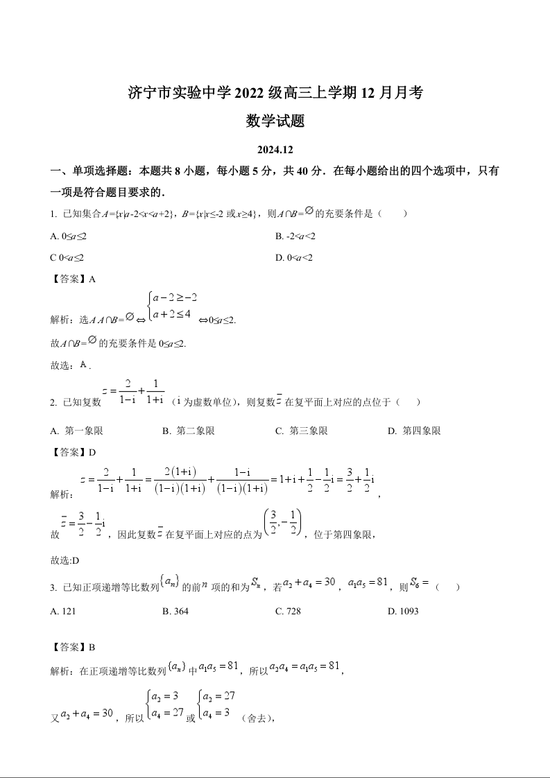 山东省济宁市实验中学2025届高三上学期12月月考数学+答案