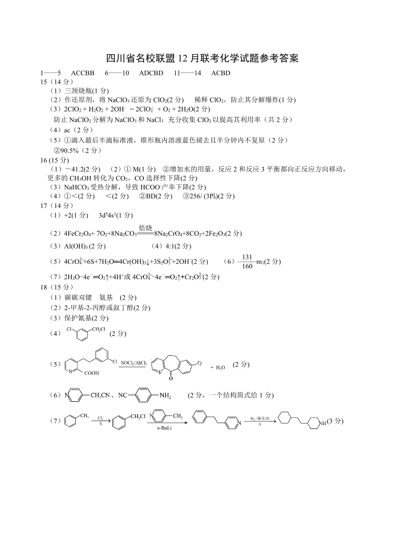 四川省名校联盟2025届高三12月联考化学答案