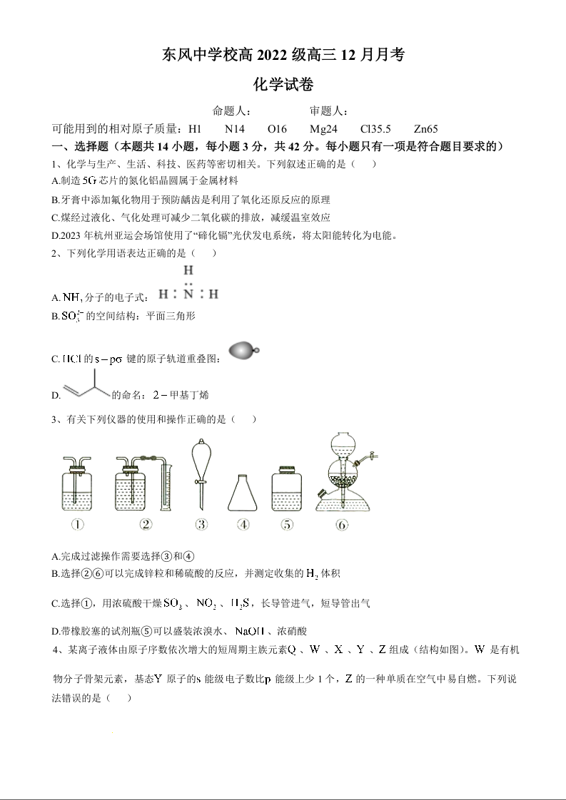 四川省南充市阆中东风学校2025届高三12月月考化学+答案
