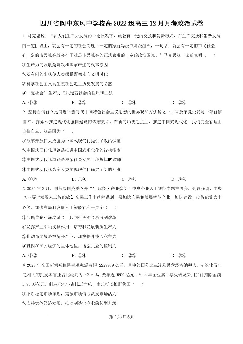 四川省南充市阆中东风学校2025届高三12月月考政治