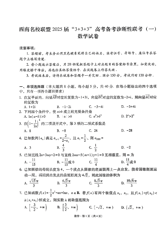 西南名校联盟2025届“3+3+3“高考备考诊断性联考(一)数学