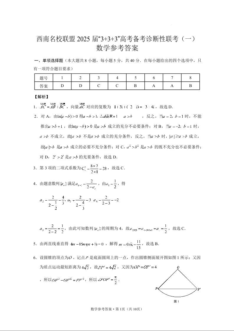 西南名校联盟2025届“3+3+3“高考备考诊断性联考(一)数学答案