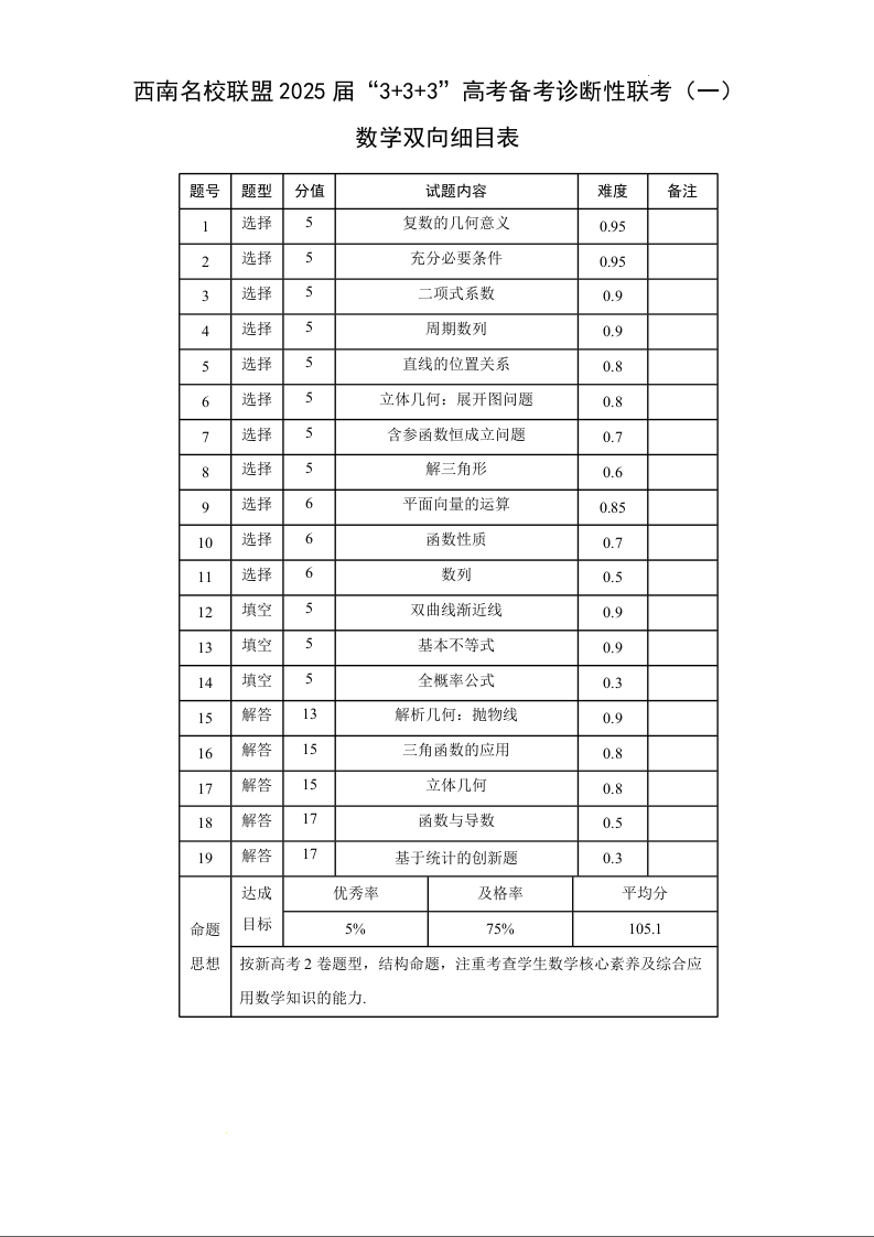 西南名校联盟2025届“3+3+3“高考备考诊断性联考(一)数学双向细目表