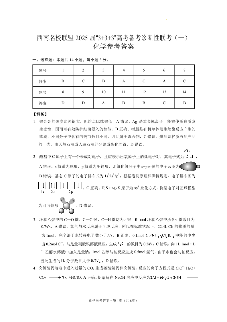 西南名校联盟2025届“3+3+3“高考备考诊断性联考(一)化学答案