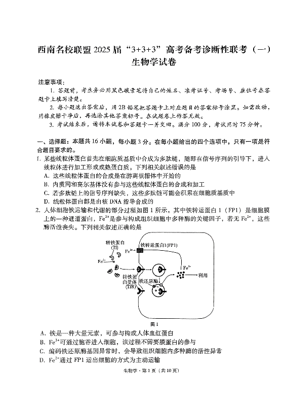 西南名校联盟2025届“3+3+3“高考备考诊断性联考(一)生物