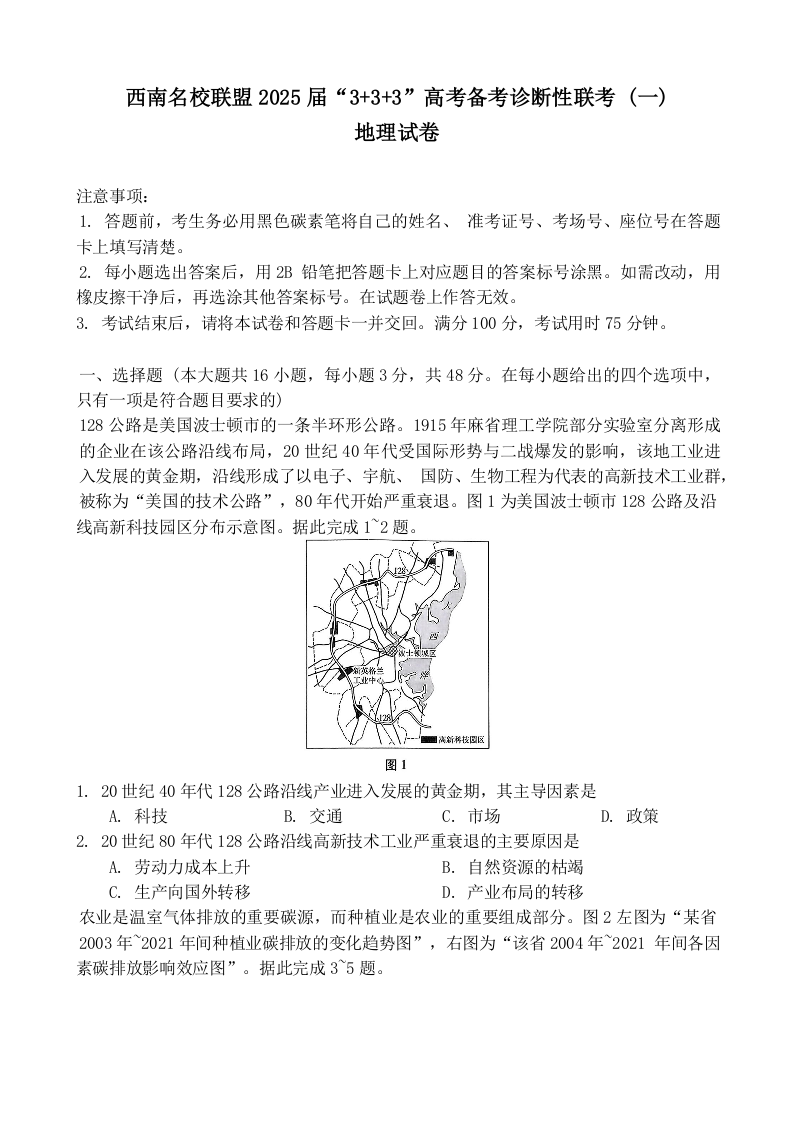 西南名校联盟2025届“3+3+3“高考备考诊断性联考(一)地理